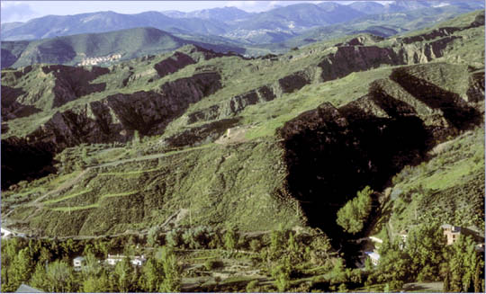El yacimiento del Cerro de la Encina se localiza estratégicamente en una elevada y escarpada cumbre sobre la margen derecha del valle labrado por el río Monachil, que desde la Vega de Granada constituye un acceso a Sierra Nevada. El conjunto viene delimitado por dos barrancos profundos al nordeste y al sudeste, actuando ambos como defensas naturales del asentamiento (Lám. 1). Lám. 1. Vista general del Cerro de la Encina