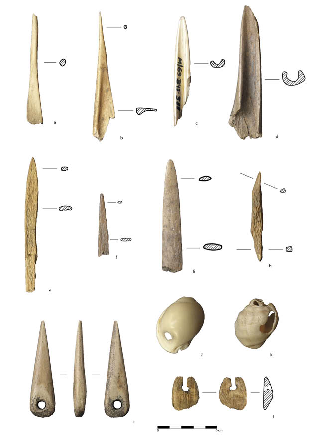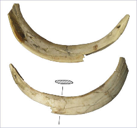 Los apuntados sobre esquirla ósea también están presentes en el Bronce Tardío, con un total de seis ejemplares. Están manufacturados sobre porciones irregulares de diáfisis de huesos largos de mamíferos de talla mediana o grande, principalmente tibias o metapodios. Los soportes se obtienen fragmentando violentamente el bloque de materia prima mediante percusión directa, obteniendo diversas porciones irregulares. Éstas son seleccionadas y por lo general tan sólo muestran un acondicionamiento de una de sus extremidades para conseguir una punta, bien mediante abrasión o bien mediante raspado con una arista. El resto del cuerpo del útil conserva normalmente las aristas resultantes de la fracturación y no muestran ningún tipo de tratamiento que suavice las irregularidades (Lám. 5: c, d, e). Por último, encontramos dos elementos indeterminados en estado fragmentario. En primer lugar, un trozo de hueso que muestra evidencias de fracturación y abrasión. En segundo lugar, un fragmento de asta de ciervo que muestra trazas producidas por un raspado previo al que se superponen estrías ocasionadas por abrasión. Para finalizar con los materiales del Bronce Tardío, vamos a analizar los elementos de adorno personal, todos ellos documentados en la denominada Zona A del yacimiento. La explotación de recursos malacológicos marinos mantiene la misma importancia y una tecnología similar a lo ya descrito para el período anterior. Se han documentado varios colgantes sobre concha entera de Glycymeris (Lám. 5: f) con una perforación del natis natural, reaprovechada para suspenderlas. Encontramos también entre las especies seleccionadas el Cardium edule y algunos moluscos gasterópodos, destacando una concha de Monodonta lineata (Lám. 5: g), una Cypraea (Lám. 5: h), y una Conus (Lám. 5: i). Por otro lado, hemos de resaltar la presencia de cuentas tubulares empleando las conchas de Dentalium, moluscos escafópodos con un caparazón de morfología alargada y tubular, tratándose en algunos casos de conchas fósiles de los mismos (Lám. 5: j). Finalmente, se han documentado dos elementos de adorno que son igualmente característicos de contextos del Bronce Pleno y Tardío. Se trata de sendos colmillos de suido (Sus scrofa) cortados longitudinalmente para la obtención de dos mitades. Una vez obtenido el soporte, se practicaron una serie de perforaciones unipolares desde la cara interna del colmillo. Existen además evidencias de un tratamiento mediante abrasión, especialmente para suavizar las aristas presentes en su cara interna tras el proceso de bipartición del colmillo (Lám. 5: k; Lám. 6). Lám. 6.