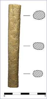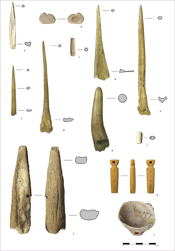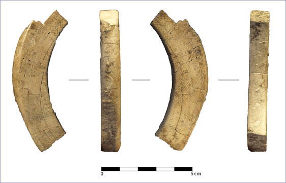 Resaltan dos artefactos apuntados sobre media tibia de ovicáprido similares a los documentados de forma muy recurrente en el Bronce Manchego y Valenciano (FONSECA FERRANDIS 1985; ALTAMIRANO GARCÍA 2010; LÓPEZ PADILLA 2011), así como también, aunque en menor medida, en otras zonas del Este y Sureste peninsular desde el III milenio A.C. (MAICAS RAMOS 2007). Se trata tibias a las que se retiró la epífisis distal y cuya diáfisis dividida por la mitad (normalmente eliminando la cresta tibial), preservando media caña y media epífisis proximal (Lám. 2: c,d). Este tipo de artefacto está ampliamente documentado en el Bronce Manchego, con un proceso de manufactura perfectamente normalizado. El ejemplar procedente de la Zona A del Cerro de la Encina no muestra las mismas técnicas de manufactura que los manchegos, ya que la bipartición en este caso podría haberse efectuado por aserrado y el interior del canal medular no presenta evidencias de limpieza mediante raspado. Por último, la superficie y la conformación de la punta se realizó mediante abrasión con grano medio y fino. Otro conjunto de útiles del Bronce Pleno que merece la pena ser destacado viene constituido por los apuntados laminares manufacturados sobre costilla o media costilla de mamífero de talla mediana o grande, posiblemente ovicáprido. Son tres los artefactos de este tipo que se han documentado y presentan un proceso de elaboración similar. En dos de ellos se procedió a un troceado o segmentación bipolar, eliminando sendas epífisis, seguido de una bipartición longitudinal de la costilla obteniendo dos mitades (Lám. 2: e, f). El otro ejemplar presenta la costilla entera, no bipartida, con uno de los extremos apuntados (Lám. 2: g). Estos soportes delgados son trabajados por abrasión, la cual afecta únicamente a la configuración de la punta y a la regularización de los bordes. Tan sólo un único caso muestra el empleo del raspado con elemento metálico para regularizar la superficie y eliminar restos de tejido blando. También realizado sobre una porción de costilla bipartida encontramos el único apuntado doble documentado para el Bronce Pleno en el Cerro de la Encina (Lám. 2: h). Se trata de una pequeña pieza que presenta sendos extremos aguzados por abrasión. Este tipo de útiles son muy abundantes en contextos de cronología similar en yacimientos del Bronce Manchego y Valenciano (ALTAMIRANO GARCÍA 2010, 2011; LÓPEZ PADILLA 2011). Una de las piezas más singulares y bellas del conjunto es un elemento apuntado con perforación de su extremidad proximal. Se trata de una aguja elaborada sobre una porción de asta de ciervo, la cual presenta una un tratamiento por raspado para configurar la preforma del útil, realizando a continuación la perforación bipolar proximal mediante un movimiento rotatorio con un útil punzante seguramente de metal (Lám. 2: i). Por último, se empleó la abrasión para suavizar la superficie y darle el acabado final, presentando actualmente su superficie un brillo intenso resultado de su uso como aguja y el roce continuado con algún tipo de fibras. Además, se han documentado tres útiles apuntados sobre esquirlas de hueso largo, preferentemente tibia o metápodo. El proceso de manufactura se reduce a una fracturación del bloque primario mediante percusión directa con percutor duro, obteniendo diversos soportes irregulares. Éstos son posteriormente tratados mediante abrasión, la cual afecta únicamente a la punta, quedando el resto del útil con un perfil bastante irregular y con la parte correspondiente de la cavidad medular. Finalmente, hemos de analizar los elementos de adorno personal documentados en los niveles del Bronce Pleno del Cerro de la Encina. Su número es reducido en comparación con los útiles descritos anteriormente, conformando un conjunto de cuatro artefactos. Excepto en un caso, estos ornamentos fueron manufacturados sobre soporte malacológico, empleando en todos los casos conchas de moluscos marinos, tanto bivalvos como gasterópodos. Resalta la utilización de conchas del género Glycymeris., especie más frecuente en los diferentes asentamientos humanos desde el III milenio A.C. que hemos venido estudiando. Se trata de normalmente de colgantes sobre concha entera, habiéndose documentado un ejemplar completo y un fragmento. En la mayoría de los casos, presentan una perforación (en ocasiones natural) en el umbo, la cual se usaría para poder suspender la pieza, ya sea de forma individual o integrada en un collar más complejo. El fragmento, por el contrario, parece una reutilización de un objeto de mayor tamaño, al cual se le practicó una perforación en su parte central. Se documenta también el uso de conchas enteras de gasterópodos, tales como una Thais haemastoma, que presenta una perforación para poder suspenderla (Lám. 2: j), y otros sobre concha de Cassis sp. (Lám. 2: k). Las dos últimas piezas de adorno son unas de las más especiales que se han documentado hasta la fecha en el Cerro de la Encina, dentro del conjunto de industria ósea. En ambos casos, se trata de dos artefactos elaborados sobre una materia prima muy especial y exótica, considerada de prestigio: marfil. La primera de ellas es una pequeña porción de marfil de forma trapezoidal e irregular obtenida a partir de una rodaja cortada del colmillo, tal y como se desprende de la presencia de las líneas de Schreger en la superficie de sendas caras (Lám. 2: l). En el segundo ejemplar, encontramos un fragmento de brazalete de sección plano-convexa documentado en la Zona A, ligado a la fortificación (Lám. 3). Para su fabricación, se procedió al aserrado transversal de una rodaja de marfil de un colmillo de elefante, a partir de la cual se extrajo una porción circular que se configuraría posteriormente como brazalete mediante el facetado y abrasión de sendas caras laterales (exterior e interior). Su superficie muestra una conservación muy buena, apreciá