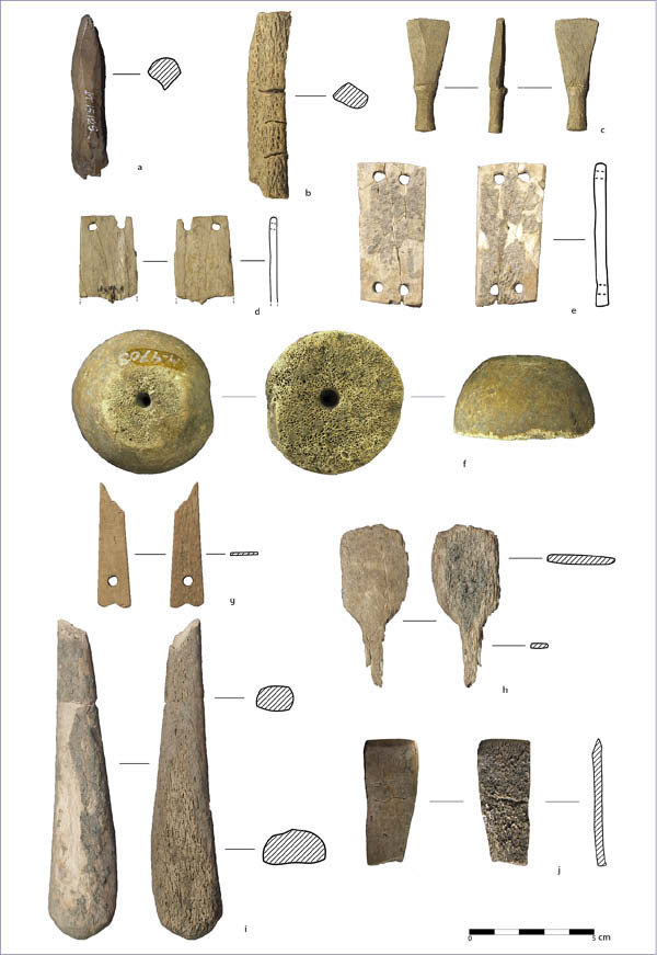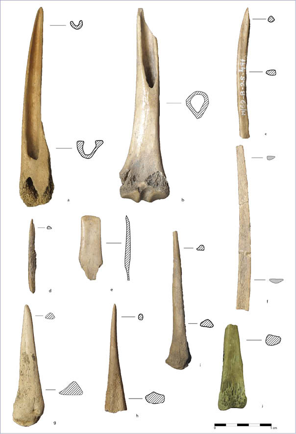 La presencia de marfil en los contextos arqueológicos peninsulares es una realidad desde finales del IV milenio A.C. e inicios del III milenio A.C., tal y como reflejan los interesantes trabajos llevados a cabo en los últimos años por diversos investigadores como A. Banerjee (2012) o Th. Schuhmacher (2012). Según se desprende de los análisis, la mayor parte del marfil analizado para contextos de la primera mitad del II milenio A.C. pertenece a elefante, concretamente al elefante africano de estepas (SCHUHMACHER 2012: 59-63). En los próximos meses esperamos llevar a cabo el estudio en profundidad de ésta y otras piezas ebúrneas prehistóricas mediante análisis óptico de las líneas de Schreger, espectroscopia infrarroja según la transformación de Fourier (FTIR) e isotopía. Con ello conoceremos la especie de elefante y procedencia del marfil empleado para la elaboración de estas piezas del Cerro de la Encina y de otras procedentes de otros yacimientos peninsulares, enriqueciendo la investigación de este tipo de materiales singulares durante el Bronce Pleno. El Bronce Tardío (1600-1400 A.C.) Para este momento de la ocupación del yacimiento contamos con un total de 36 artefactos óseos, de los cuales la mayoría están manufacturados sobre hueso. Todo el material asignado a este momento de ocupación fue documentado en las excavaciones desarrolladas en la denominada Zona A del asentamiento. Se trata de un conjunto que muestra gran continuidad tanto a nivel de materia prima como de tecnología en relación con el período anterior, si bien se constatan algunas diferencias claras. Realmente, hemos de considerar este momento como una continuidad cultural y poblacional, tal y como se refleja en los distintos elementos de cultura material (ARRIBAS PALAU et al. 1974; MOLINA GONZÁLEZ 1976, 1978, 1983; ARANDA JIMÉNEZ y MOLINA GONZÁLEZ 2005, 2006). Se observa nuevamente un predominio de las osamentas de ovicápridos para la elaboración de la mayor parte de los útiles, siendo estos rebaños de pequeños rumiantes los más abundantes desde el inicio de la ocupación del asentamiento. No obstante, se ha documentado un aumento muy notable del caballo, siendo mayor su porcentaje en comparación con los ovicápridos tal y como se desprende del número de huesos estudiados correspondientes al Bronce Tardío (66% équidos frente a 15% de ovicápridos) (SALVATIERRA CUENCA 1978: 50). Es ahora cuando aparecen utilizados los metapodios y cúbitos de équidos para la manufactura de ciertos útiles apuntados. Por último, continúa igualmente la selección de fíbulas se suido para manufacturar artefactos, manteniéndose la importancia del cerdo en los conjuntos de fauna hasta los momentos finales del Bronce Tardío (DRIESCH 1974; SALVATIERRA CUENCA 1978: 46). En cuanto a los tipos de útiles más frecuentes en este período encontramos lo siguiente. Por un lado, apuntados sobre tibia de ovicáprido, los cuales no muestran una uniformidad en los métodos y técnicas empleados para su manufactura. Uno de los ejemplares (Lám. 4: a), muestra evidencias de una abrasión intensa de una de sus caras hasta alcanzar el canal medular, quedando media caña y una extremidad activa apuntada. Es interesante resaltar que la abrasión se practica sobre el lateral derecho de la tibia, eliminando previamente la epífisis distal, y afectando únicamente a la mitad de la caña. En los útiles del Bronce Pleno es más frecuente la eliminación de la cara superior, retirando la cresta tibial y quedando media caña, al igual que en otros ejemplares del Bronce Manchego y Valenciano (ALTAMIRANO GARCÍA 2011; LÓPEZ PADILLA 2011). Lám. 4.