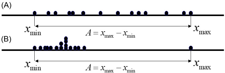 Se trata de la medida de dispersión más sencilla e inmediata. El rango (\(R\)), o amplitud (\(A\)), que queda definido como la diferencia entre el máximo y el mínimo de los valores de la variable \[R=x_{max} - x_{min}.\] Es una medida intuitiva y rápida de obtener, pero presenta el problema de que solo depende de dos observaciones, las dos extremas. Esto tiene dos implicaciones, por un lado, tal y como se ilustra en la Figura 4.13, no distingue entre una situación en donde el resto de las observaciones se reparten de forma homogénea entre los dos extremos (mayor variabilidad), de otra en la que todos los datos se agrupan en un intervalo reducido, dejando a uno, o a los dos extremos alejados de este grupo.