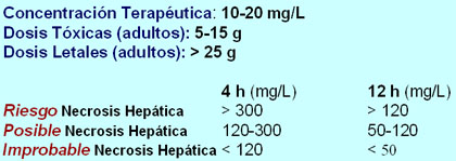 El paracetamol produce signos de hepatotoxicidad tardíos, siendo rara su manifestación antes de las 12-18 h, de ahí que tenga especial trascendencia el control analítico y cuantificación en supuestas intoxicaciones. Así, la ictericia se manifiesta a las 48-72 h y la necrosis masiva se hace aparente al 4º día, precedida usualmente de un cuadro de insuficiencia hepática. Por este motivo es fundamental conocer cuáles son las dosis tóxicas (ver esquema) y también el nomograma pronóstico de Rumack – Matthew (ver Figura).
