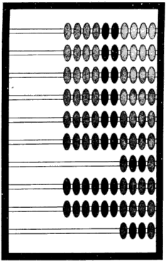 origen del «soroban» japonés puede remontarse también al siglo XVI, época en que probablemente fue traido de China. Sus cuentas tienen filos vivos; son como dos conos pegados por sus bases. Cada varilla tiene solamente una cuenta por encima de la barra, en la región que los japoneses llaman «cielo», y otras cuatro más por debajo, en la «tierra». (Antiguamente, el instrumento tenía cinco cuentas en la parte inferior de las varillas, lo mismo que su análogo chino, pero la quinta cuenta fue eliminada hacia 1920. Las dos cuentas extra del suan pan no son esenciales en el cálculo moderno, y suprimiéndolas se logra un instrumento más sencillo.) Todavía hoy se celebran anualmente en Japón concursos de cálculo con ábaco, y el soroban sigue utilizándose en tiendas y pequeños negocios, si bien los bancos y empresas grandes lo han sustituido por modernas calculadoras de mesa. No han faltado ocasiones de encuentros y justas entre abaquistas japoneses o chinos enfrentados a operadores occidentales de máquinas de cálculo digital. Quizá la ocasión más sonada fue en 1946, en Tokio, cuando el soldado Thornas Wood quedó empatado con Kiyoshi Matsuzaki. El abaquista fue siempre más rápido en todos los cálculos, excepto al multiplicar números muy grandes. Una de las razones que explican la gran velocidad de los abaquistas orientales, es preciso admitirlo, es que ejecutan mentalmente gran parte del trabajo, sirviéndose del ábaco sobre todo para registrar etapas del proceso. El principal defecto del cálculo con ábacos es la imposibilidad de guardar registro de los cálculos anteriores. De cometerse un error es preciso rehacer el cálculo completo. Para evitarlo, las firmas japonesas solían hacer que tres calculistas resolvieran simultáneamente el mismo problema. El «s'choty» usado en Rusia difiere considerablemente de los ábacos orientales. Probablemente los rusos llegaron a conocerlo a través de los árabes; todavía es empleado en ciertas regiones de la India y del Oriente Medio, donde los turcos lo llaman coulba, y los armenios, choreb. En la Rusia moderna, la situación es casi idéntica a la japonesa: casi todos los tenderos y pequeños comerciantes utilizan ábacos, mientras que en los departamentos de contabilidad de las empresas importantes han sido reemplazados por modernos ordenadores y calculadoras. El s'choty está formado por varillas o alambres horizontales, que casi siempre contienen diez cuentas; las dos cuentas centrales son de distinto color para indicar por dónde deben separarse. Las varillas de cuatro cuentas que vemos en la ilustración se usan para fracciones de rublo o kopeck. |