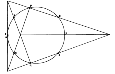 Otro teorema muy elegante es el famoso «de los nueve puntos», en el cual parece surgir de la nada una circunferencia, lo mismo que en el de Morley se materializa insospechadamente un triángulo equilátero. Fue descubierto por dos matemáticos franceses, quienes lo publicaron en 1821. Dado un triángulo cualquiera, situemos en él tres ternas de puntos (véase la figura): los puntos medios (a, b, c) de los tres lados; los pies (p, q, r) de las tres alturas; y los puntos medios (x, y, z) de los segmentos rectilíneos que unen cada vértice con el ortocentro (intersección de las tres alturas). Como muestra la ilustración, estos nueve puntos yacen sobre una misma circunferencia, resultado sorprendente que abre paso a otra multitud de teoremas. Por ejemplo no es difícil demostrar que el radio de la circunferencia trazada por estos nueve puntos es precisamente la mitad del radio de la circunferencia circunscrita al triángulo de partida. La propiedad de las alturas de cortarse en un solo punto (ortocentro) es de por sí interesante; Euclides no la menciona, y aunque Arquímedes la da a entender parece ser que no fue enunciada explícitamente hasta Proclo, filósofo y geómetra del siglo V.