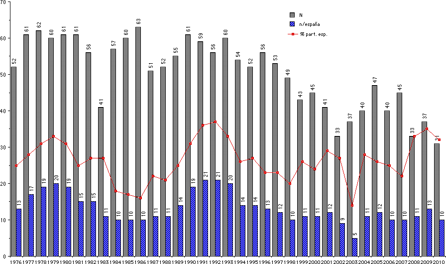 Número de proyectos en activo (barras con rallado negro), grupos de trabajo españoles (barras azuladas) y porcentajes correspondientes a la participación española en cada año (línea roja).