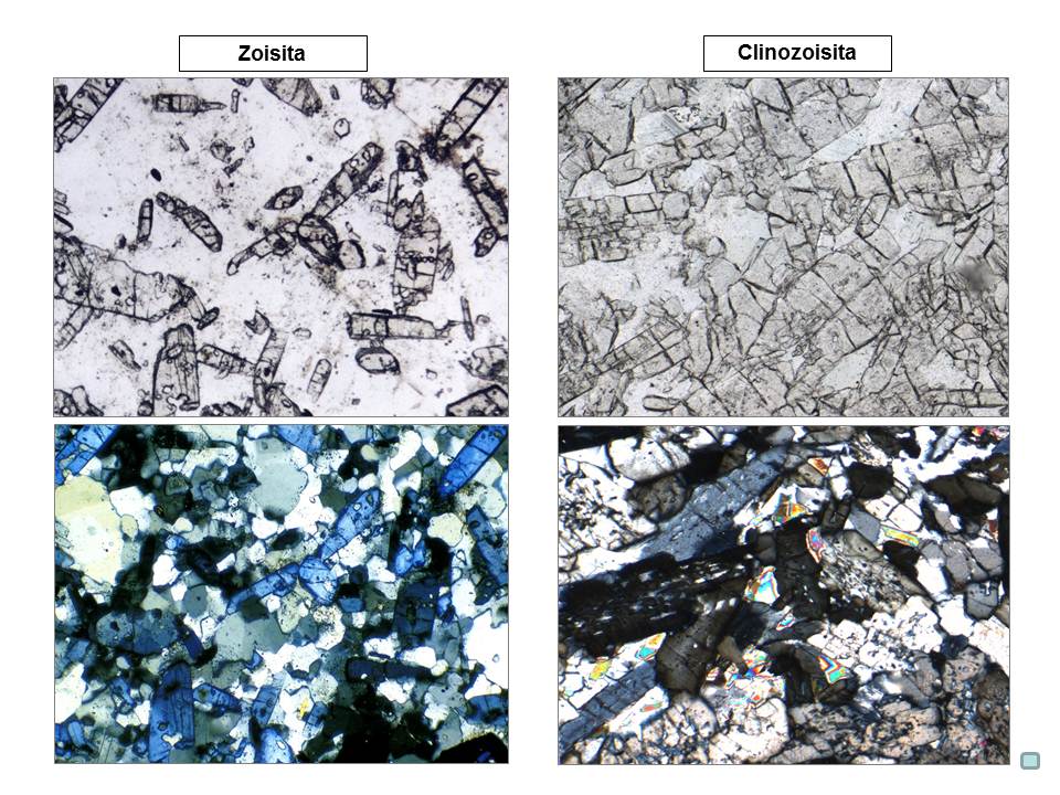 Lawsonita Lawsonite CaAl2Si2O7(OH)2.H2O Rómb.Zoisita Zoisite Ca2Al3(SiO4)3(OH) Rómb.
